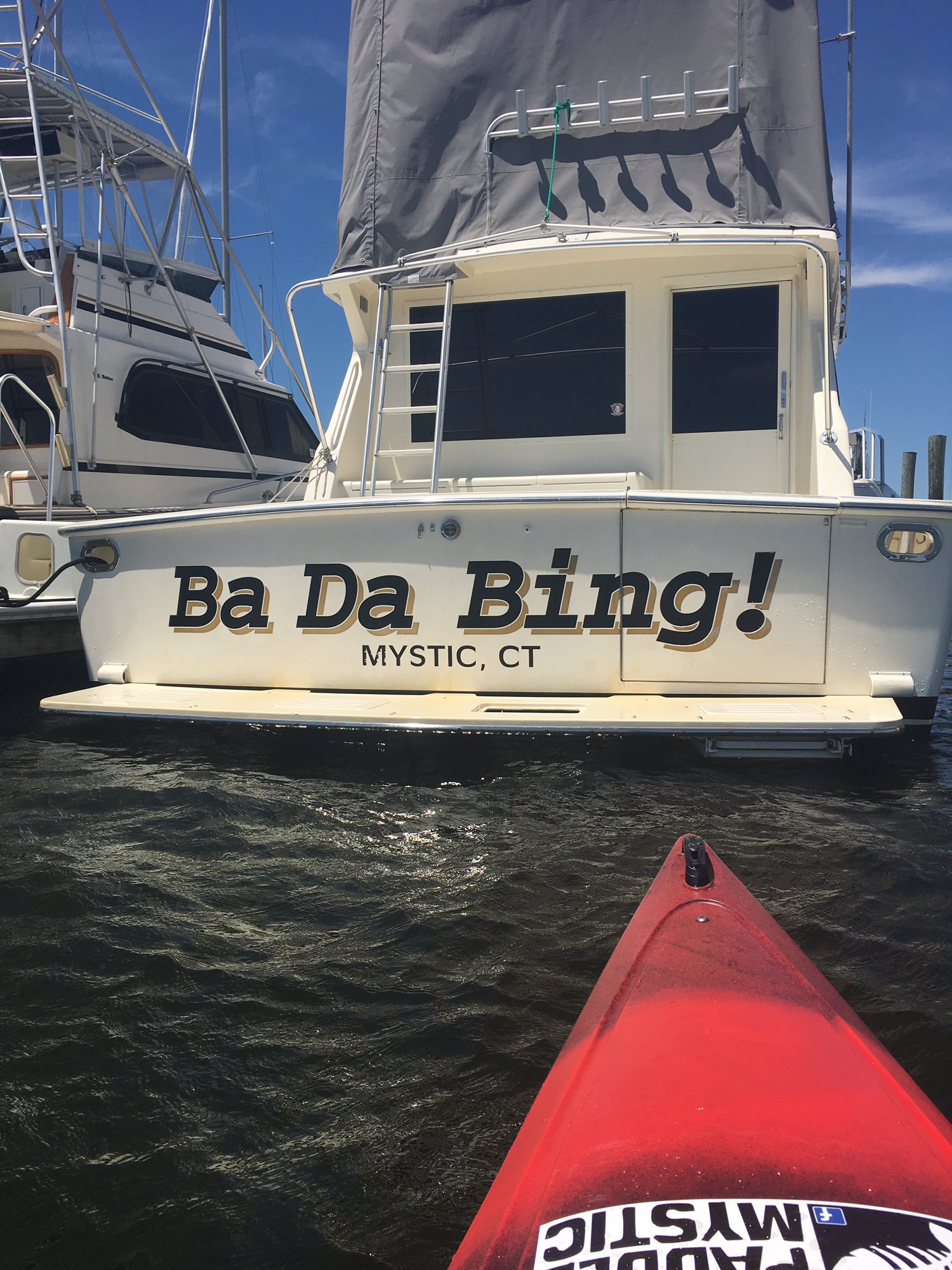 The boat Laszlo and Colin Robinson steal is called The Stugots which was what Tony Soprano named his boat. The real word is CAZZO. Ad vertisement from shop.